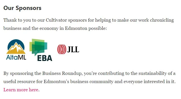 A few months ago, the Edmonton Business Association (EBA) began sponsoring Taproot’s weekly Business Roundup, a curated email chronicling Edmonton’s business community and economy. Each week the Business Roundup helps save business owners time and keeps them informed by presenting the latest local business headlines and happenings from a trustworthy source.
